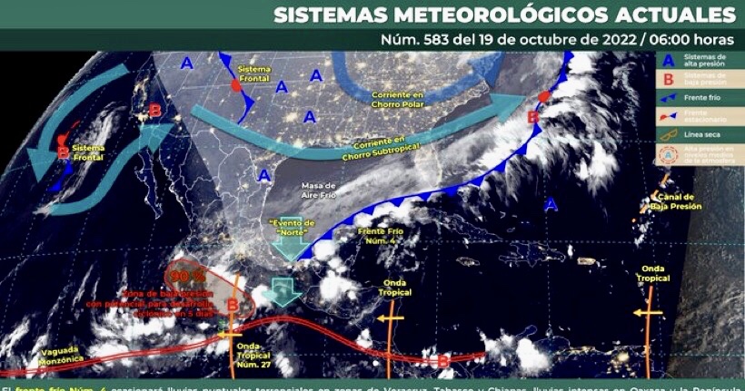 El Frente Frío número 14 ocasionará evento de “Norte” intenso en el Golfo de México, Istmo y Golfo de Tehuantepec, así como lluvias intensas a torrenciales, mientras que una baja presión con alto potencial ciclónico ocasionará lluvias puntuales intensas vientos fuertes y oleaje en Guerrero.