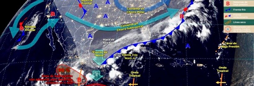 Este día, el frente frío Núm. 4 se extenderá sobre el sureste mexicano y la Península de Yucatán, ocasionará lluvias puntuales torrenciales en zonas de Veracruz, Tabasco y Chiapas, lluvias intensas en Oaxaca y la Península de Yucatán, además de lluvias muy fuertes en Puebla. Las lluvias mencionadas podrían originar incremento en los niveles de ríos y arroyos, deslaves e inundaciones en zonas bajas de las entidades mencionadas. La masa de aire frío asociada al frente, mantendrá evento de “Norte” muy fuerte a intenso en el litoral del Golfo de México, Istmo y Golfo de Tehuantepec, así como descenso de las temperaturas en el norte, noreste, centro y oriente del territorio nacional, con ambiente frío a muy frío durante la madrugada y heladas en zonas altas de la Mesa del Norte y la Mesa Central. A su vez, se prevé la caída de aguanieve o nieve en cimas por arriba de los 4,000 m.s.n.m. del Estado de México, Puebla, Tlaxcala y Veracruz. Por otro lado, la onda tropical Núm. 27 será absorbidapor la zona de baja presión con alta probabilidad de desarrollo ciclónico que se desplazará al sur de la costa de Guerrero, la cual generará lluvias puntuales intensas, fuertes rachas de viento y oleaje elevado en dicho estado, además de lluvias puntuales fuertes en Michoacán. Finalmente, el ingreso de humedad del Océano Pacífico y aire inestable superiorpropiciarán chubascos vespertinos y lluvias puntuales fuertes sobre entidades del occidente y centro de la República Mexicana.