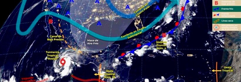 Este día, la tormenta tropical “Roslyn” se desplazará cerca de las costas de Colima y Michoacán, sus bandas nubosas producirán lluvias puntuales intensas en dichas entidades, además de Guerrero; así como lluvias fuertes en Jalisco. A su vez, se prevén vientos fuertes y oleaje elevado desde las costas de Guerrero hasta Jalisco. Las lluvias mencionadas podrían ocasionar incremento en los niveles de ríos y arroyos, deslaves e inundaciones en zonas bajas de los estados indicados. Por otro lado, un canal de baja presión aunado al ingreso de humedad generado por “Roslyn” propiciarán lluvias y chubascos vespertinos sobre estados de la Sierra Madre Occidental y el centro del país. A su vez, la onda tropical Núm. 28 se desplazará sobre el Golfo de Tehuantepec, ocasionando lluvias puntuales fuertes en Oaxaca y Chiapas, así como chubascos en Veracruz y Tabasco, mientras que el ingreso de humedad del Golfo de México y Mar Caribe ocasionará lluvias y chubascos dispersos sobre la Península de Yucatán y el oriente del territorio nacional. Finalmente, la masa de aire frío asociada al frente Núm. 4, modificará sus características térmicas permitiendo un gradual incremento en las temperaturas vespertinas sobre la Mesa del Norte y la Mesa Central, sin embargo, durante la madrugada y la mañana el ambiente continuará siendo frío con posibles heladas en zonas serranas de dichas regiones.
