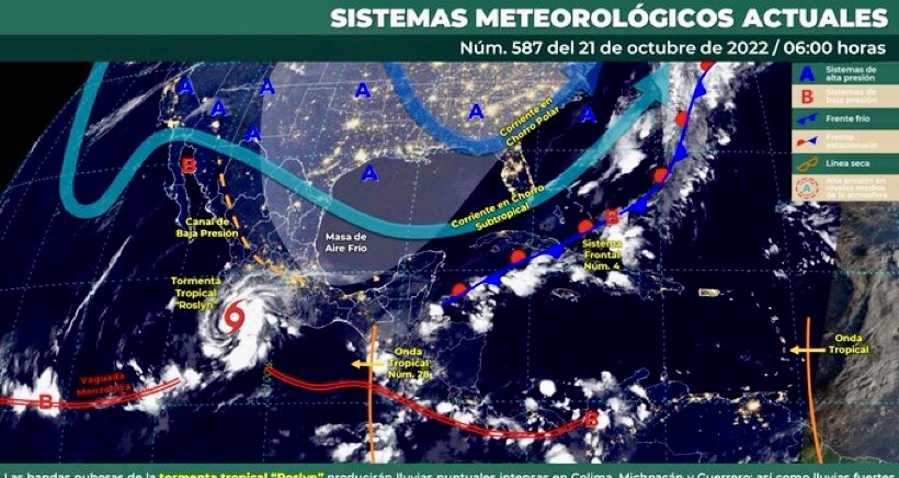 La Tormenta Tropical “Roslyn” ocasionará lluvias fuertes a intensas, rachas de viento y oleaje elevado en Jalisco, Colima, Michoacán y Guerrero.