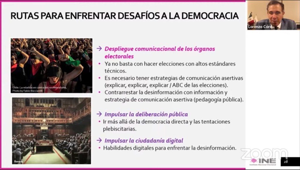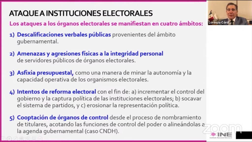 En América Latina, añadió Lorenzo Córdova, la situación de los institutos electorales ha sido igual, con descalificaciones y amenazas; “los gobernantes o candidatos acusan a las autoridades electorales de fraude, para que si pierden puedan culpar de fraude y si ganan, decir que ganan a pesar de los fraudes. Estos son fenómenos que se presentan en mayor o menor medida en América Latina”.