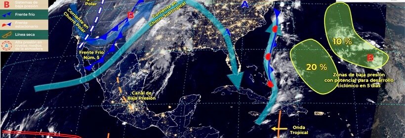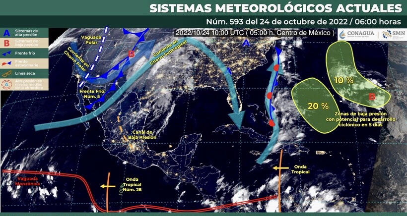 Durante este día, el frente frío Núm. 5 recorrerá el noroeste y norte del país, en interacción con una vaguada polar y con la corriente en chorro subtropical, ocasionarán probabilidad de caída de aguanieve en zonas serranas del norte de Sonora y Chihuahua durante la mañana, así como lluvias con chubascos y rachas fuertes de viento en el noroeste, norte y noreste del territorio nacional, además de descenso en las temperaturas diurnas sobre entidades del noroeste y norte del país. Por su parte, el ingreso de humedad del Océano Pacífico y Golfo de México generará lluvias y chubascos dispersos sobre el occidente, centro, oriente, sur y sureste del país. Finalmente, la onda tropical Núm. 28 se desplazará al suroeste de las costas de Michoacán y Jalisco, sin afectar al territorio nacional.