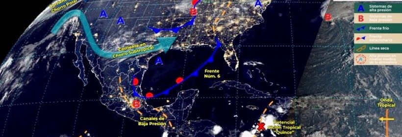 Este día, el frente Núm. 6 adquirirá características cálidas en el oeste del Golfo de México y reforzará la entrada de humedad hacia el noreste del país, en interacción con un vórtice en niveles altos de la atmósfera y una vaguada polar, originarán lluvias fuertes a muy fuertes, descargas eléctricas, caída de granizo, rachas de viento de 50 a 70 km/h y posible formación de torbellinos y tornados en zonas de Coahuila, Nuevo León y Tamaulipas. Canales de baja presión sobre el centro y sureste del territorio nacional, asociado al ingreso de humedad proveniente de ambos litorales, generarán lluvias y chubascos con tormentas eléctricas en Querétaro, Hidalgo, Estado de México, Ciudad de México, Morelos, Tlaxcala, Puebla, Guerrero, Oaxaca, Veracruz y Chiapas.