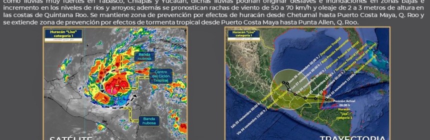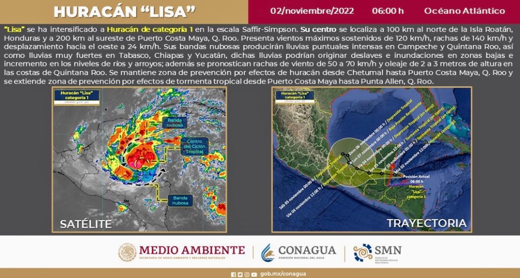 #Lisa ahora como huracán de categoría 1, en la escala Saffir-Simpson, se localiza a 200 km al sureste de Puerto Costa Maya, #QuintanaRoo. Su circulación producirá #Lluvias muy fuertes a intensas en estados de la #PenínsulaDeYucatán y el sureste de #México.