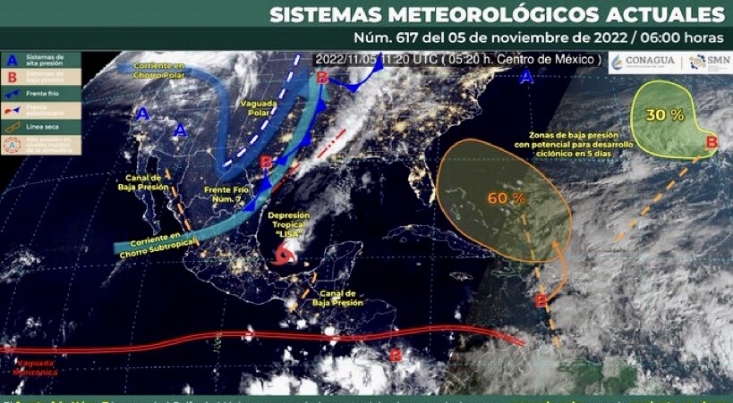 Para hoy, el frente frío Núm. 7 ingresará al Golfo de México y recorrerá el noreste del país, se asociará con una vaguada polar y con la corriente en chorro subtropical, ocasionando rachas de vientos de 50 a 60 km/h con tolvaneras en zonas de Coahuila, Nuevo León y Tamaulipas, así como chubascos con descargas eléctricas en Tamaulipas. La masa de aire frío que impulsa al frente, mantendrá el ambiente matutino frío sobre los estados del norte a muy frío en entidades del noroeste del país, con temperaturas mínimas inferiores a -5 °C y heladas en zonas serranas de Chihuahua y Durango. La depresión tropical “Lisa” se desplazará sobre el suroeste del Golfo de México y su circulación reforzará la probabilidad de lluvias puntuales muy fuertes en Veracruz y Tabasco, y puntuales fuertes en Campeche. Durante este día se prevé que “Lisa” se degrade a una baja presión remanente. Asimismo, un canal de baja presión que se extenderá sobre el sureste del territorio nacional, ocasionará lluvias puntuales intensas en Chiapas y puntuales fuertes en Oaxaca. Finalmente, el ingreso de humedaddel Océano Pacífico y Golfo de México, ocasionará chubascos acompañados de descargas eléctricas en Hidalgo, Estado de México, Morelos, Puebla y Guerrero.