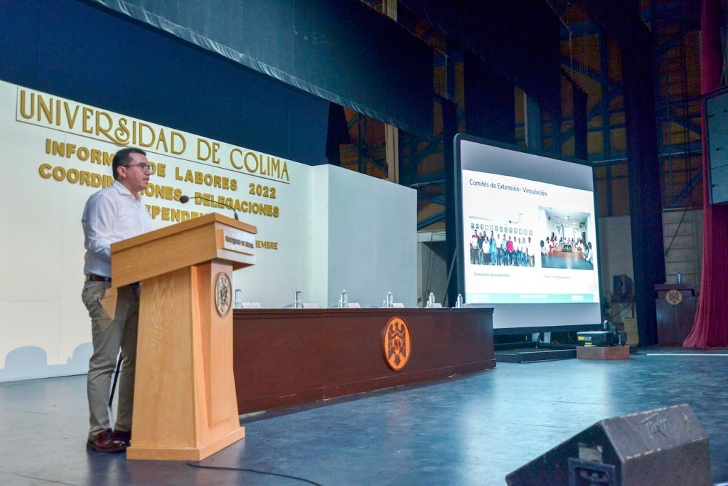 Tocó el turno de rendir su informe de labores al coordinador general de Extensión de la Universidad de Colim, Carlos Ramírez Vuelvas, quien dio un reporte detallado y puntual de sus logros en educación pertinente y de calidad, investigación para la formación y el desarrollo, extensión universitaria y gobernanza institucional.