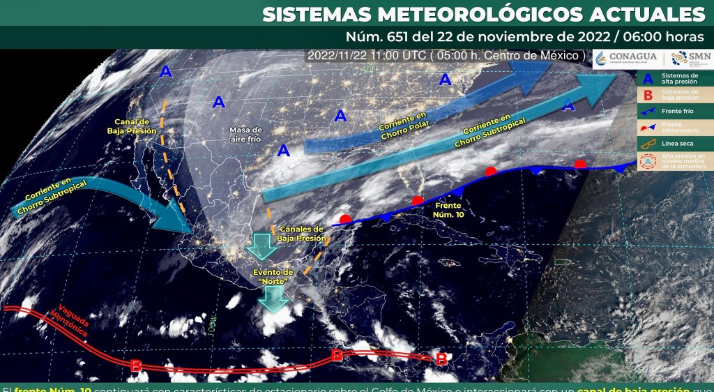 El Frente Frío número 10 producirán lluvias puntuales fuertes a intensas en el sureste de México y península de Yucatán, así como evento de “Norte” en el litoral del Golfo de México, Istmo y Golfo de Tehuantepec.