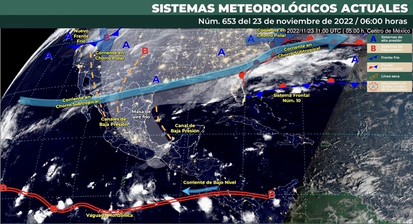 Para hoy, un canal de baja presión sobre el occidente del Golfo de México mantendrá la probabilidad de lluvias puntuales muy fuertes en Chiapas y Tabasco, fuertes en Veracruz y Oaxaca, mismas que podrían originar incremento en los niveles de ríos y arroyos, deslaves e inundaciones en zonas bajas. Por su parte, la masa de aire frío que impulsó al frente Núm. 10 comenzará a modificar sus características térmicas, favoreciendo un ascenso de las temperaturas máximas sobre entidades del norte, noreste, oriente y centro de la República Mexicana, así como la disminución en la intensidad del viento de componente norte sobre el litoral del Golfo de México, Istmo y Golfo de Tehuantepec. Además, la entrada de humedad de ambos océanos ocasionará lluvias y chubascos dispersos en zonas del norte, occidente, centro y sur del país. Finalmente, una línea seca se establecerá sobre el norte de México, con la aproximación de un nuevo frente frío originarán vientos de 40 a 50 km/h en Chihuahua, Durango y Coahuila al final del día.