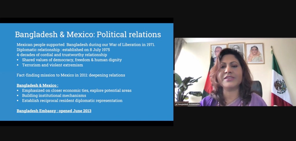 En su conferencia, señaló que México fue el principal destino de las exportaciones de Bangladesh en América Latina (2020). Por su parte, Bangladesh es el décimo quinto socio comercial de México en Asia-Pacífico. Cabe mencionar que en 2012 Bangladesh abrió su primera embajada en la Ciudad de México y en 2015 el ministro de Estado bangladesí, Shahriar Alamhahriar Alam, realizó una visita a México para celebrar los 40 años de relaciones diplomáticas. Durante este tiempo, Bangladesh y México han expresado su interés mutuo por ampliar las actividades económicas bilaterales.