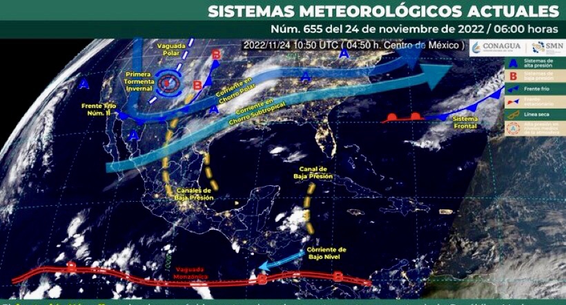 Durante este día, el frente frío Núm. 11 se desplazara rápidamente sobre el noroeste, norte y noreste de la República Mexicana, se asociará en altura con un vórtice de núcleo frío, una vaguada polar y con la corriente en chorro polar, dando origen a la primera tormenta invernal de la temporada, ocasionando rachas de viento muy fuertes con tolvaneras, marcado descenso de las temperaturas, además de lluvias y chubascos, con posible caída de nieve o aguanieve durante la noche en las sierras de Chihuahua, Coahuila y Sonora (noreste y oriente). Asimismo, el ingreso de humedad del Océano Pacífico y Golfo de México, ocasionará lluvias y chubascos dispersos con posibles descargas eléctricas sobre estados del occidente, centro, oriente, sur y sureste del territorio nacional, incluido el Valle de México.