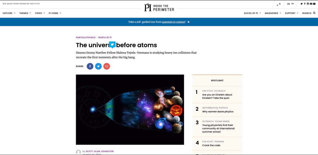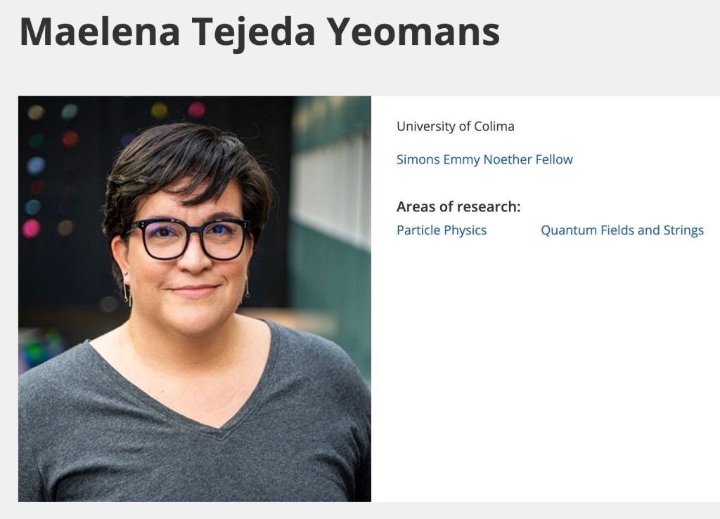 El Instituto Perimeter, un centro de investigación científica, de entrenamiento y educación en física teórica de Ontario, Canadá, publicó una extensa entrevista con la Dra. María Elena Tejeda Yeomans, profesora investigadora de la Facultad de Ciencias de la Universidad de Colima, en la que abordan su interés por la ciencia, su formación académica, su interés por comprender qué sucedió cuando el universo se enfrió y los quarks y gluones comenzaron a congelarse, y su vocación por promover, sobre todo entre las estudiantes más jóvenes, el gusto por seguir una carrera científica.