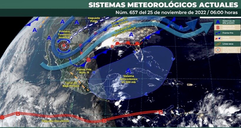 Para hoy, la primera tormenta invernal de la temporada se ubicará sobre Chihuahua, Coahuila, oriente de Sonora y norte de Durango, mientras que el frente frío Núm. 11 y su masa de aire polar se extenderán sobre el norte y noreste del territorio nacional, lo que generará rachas de viento fuertes a muy fuertes y posibles tolvaneras, ambiente matutino muy frío a gélido con heladas en zonas serranas y ambiente diurno fresco a templado, además de chubascos y lluvias puntuales fuertes en dichas regiones, incluido el noroeste del país. Posible caída de nieve o aguanieve en las sierras de Sonora, Chihuahua, Coahuila, Nuevo León y Durango. Durante la noche de hoy y madrugada del sábado, iniciará un nuevo evento de “Norte” con rachas de 50 a 70 km/h y oleaje de 1 a 3 metros de altura en las costas de Tamaulipas y norte de Veracruz. Por otro lado, el ingreso de humedad del océano Pacífico, Golfo de México y Mar Caribe, originará lluvias puntuales fuertes en Oaxaca y Chiapas, y chubascos sobre entidades del occidente, centro y sur del país, además de la Península de Yucatán; todas con descargas eléctricas. Por su parte, un sistema de alta presión en niveles medios de la atmósfera originará incremento de las temperaturas vespertinas sobre el sur y sureste de la República Mexicana.
