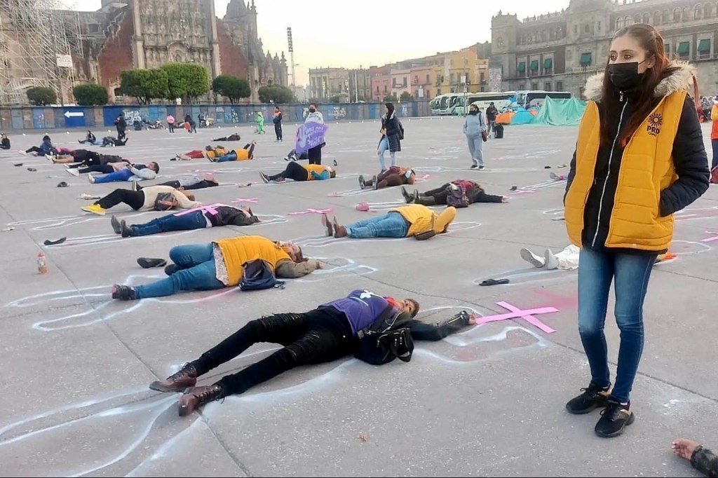 Simpatizantes del Partido de la Revolución Democrática (PRD) pintaron este viernes siluetas de mujeres en la plancha del Zócalo.