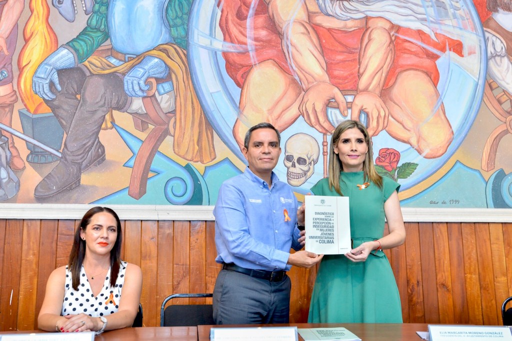 Este jueves, en la presentación del proyecto “Corredores seguros” del Ayuntamiento de Colima, que encabeza Margarita Moreno, el rector Christian Jorge Torres Ortiz Zermeño entregó el “Diagnóstico sobre la experiencia y percepción de inseguridad en mujeres jóvenes universitarias de Colima”, elaborado por investigadores, investigadoras y estudiantes de la Facultad de Ciencias Políticas y Sociales de la Universidad de Colima, que contribuirá al diseño de estrategias de seguridad por parte de las autoridades municipales.