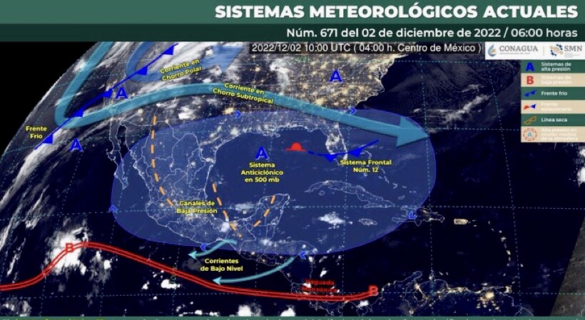 Este día, el sistema frontal Núm. 12 se extenderá como estacionario sobre el oriente del Golfo de México, sin efectos significativos sobre el país. La masa de aire frío asociada a dicho frente, ha comenzado a modificar sus características térmicas, lo que permitirá un gradual incremento de las temperaturas diurnas sobre la Mesa del Norte y la Mesa Central, sin embargo, durante la mañana y la noche, el ambiente continuará frío a muy frío, con heladas en zonas montañosas. Un canal de baja presión sobre el sureste mexicano y la Península de Yucatán, producirá lluvias fuertes en dichas regiones, con puntuales muy fuertes en Chiapas y Tabasco. A su vez, el ingreso de humedad del Océano Pacífico y Golfo de México, en interacción con un canal de baja presión en el occidente del país, ocasionará lluvias y chubascos vespertinos con posibles descargas eléctricas en dicha región, además del centro y sur de la República Mexicana. Finalmente, la aproximación de un frente frío al noroeste del país y el paso de la corriente en chorro subtropical, generarán nublados y lluvias aisladas en Baja California y Sonora.