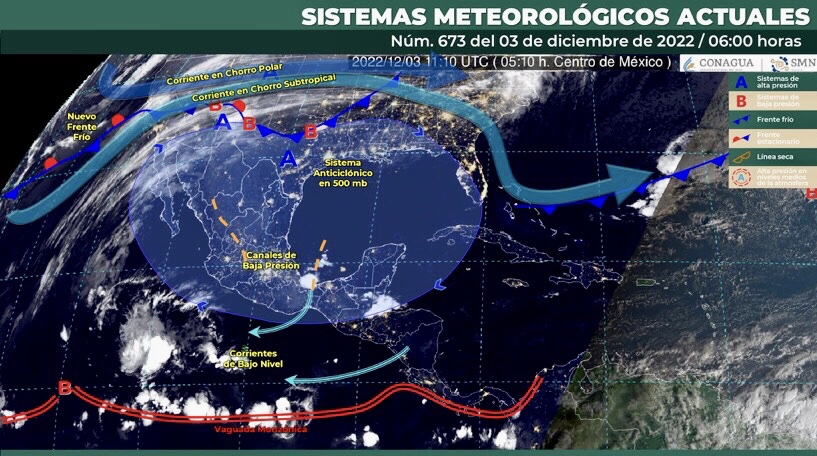 Para hoy, un nuevo frente frío ingresará sobre la frontera norte de la República Mexicana, en interacción con el arrastre de humedad generado por la corriente de chorro subtropical, originará lluvias y chubascos sobre entidades del noroeste y norte del país, con lluvias puntuales fuertes en Baja California y Sonora, así como rachas de viento 40 a 60 km/h en Chihuahua y Coahuila. Por otro lado, canales de baja presión sobre el centro y el sureste del país, además de la Península de Yucatán, en combinación con la entrada de humedad del Océano Pacífico y Golfo de México, originarán chubascos y lluvias puntuales fuertes sobre estados del noreste, oriente, sureste, occidente y centro del país, incluida la Península de Yucatán, con lluvias puntuales muy fuertes en Veracruz, Chiapas y Tabasco, además de viento de componente norte de 60 a 80 km/h en el Istmo y Golfo de Tehuantepec. Un sistema de alta presión en niveles medios de la atmosfera, se extenderá sobre gran parte del territorio nacional.