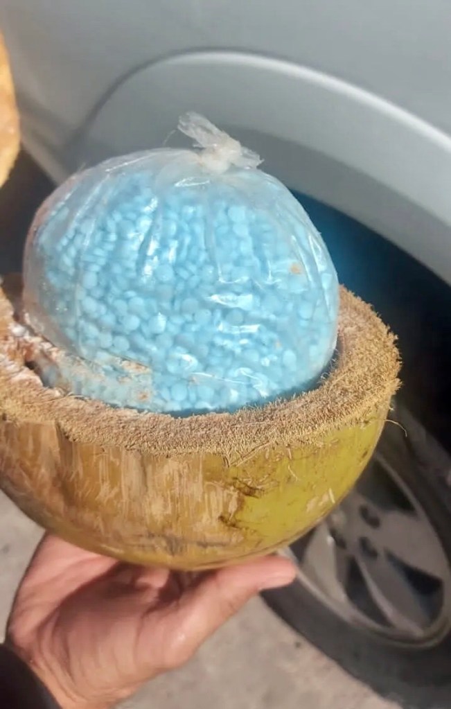 Según las imágenes, los frutos estaban partidos por la mitad y en su interior transportaban bolsas con cientos de pastillas de color azul, presuntamente de fentanilo