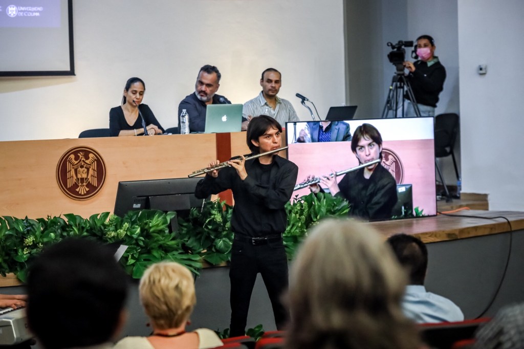 Gabriel, estudiante de flauta del Bachillerato de Música, interpretó una pieza musical durante este panel. Tras su intervención, su maestro Gregorio Torres contó a los presentes cómo llegó Gabriel al IUBA, al curso básico que ofrece la escuela, con una flauta que “es modesta, pero ha hecho maravillas y desarrollado un sonido que no es fácil con un instrumento que es modesto”.