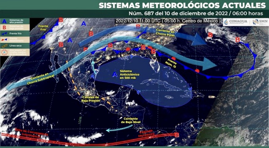 Este día, una nueva masa de aire frío reforzará al frente Núm. 15 sobre el norte y noreste del país, el cuál interaccionará con la corriente en chorro subtropical y con la entrada de humedad del Golfo de México, generando lluvias, vientos fuertes y ligero descenso de las temperaturas en dicha región. Dos canales de baja presión sobre el occidente y sureste de México, en combinación con la entrada de humedad proveniente del Océano Pacífico y Golfo de México, originarán chubascos acompañados de posibles descargas eléctricas en Veracruz, Oaxaca, Chiapas, Tabasco, Campeche y Quintana Roo, así como lluvias aisladas en Jalisco, Colima, Michoacán, Guerrero y Yucatán.