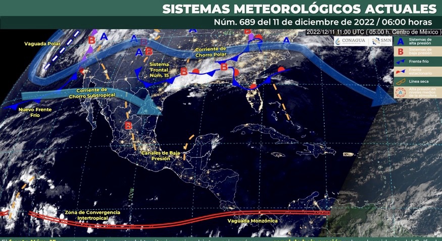 Para hoy, el frente Núm. 15 se extenderá al noreste del territorio nacional e interaccionará con un canal de baja presión sobre el occidente del Golfo de México, ocasionarán lluvias con intervalos de chubascos en zonas del norte y noreste del país. Dicho frente dejará de afectar el territorio mexicano durante el día. Por su parte, un nuevo frente fríoingresará al noroeste de México esta tarde, en interacción con una vaguada polar y las corrientes de chorro subtropical y polar, darán origen a la segunda tormenta invernal de la temporada, por lo que se pronostican lluvias y chubascos en dicha región, con lluvias fuertes en Baja California, donde existe la probabilidad de caída de aguanieve o nieve, además de rachas fuertes de viento con tolvaneras en zonas de Baja California, Sonora y Chihuahua. Las condiciones para la caída de aguanieve o nieve se extenderán hacia las sierras de Sonora durante el lunes. Por otro lado, canales de baja presión originarán lluvias y chubascos vespertinos que podrían acompañarse de descargas eléctricas en el occidente, sur y sureste del país, además de la Península de Yucatán. Finalmente, prevalecerá ambiente matutino y nocturno de frío a muy frío sobre entidades de la Mesa del Norte y Mesa Central, con heladas en sus zonas montañosas.