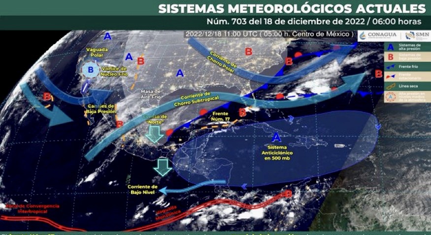 Este día, el frente Núm. 17 se extenderá con características de estacionario sobre el centro del Golfo de México e interaccionará con un canal de baja presión sobre el sureste mexicano y con la entrada de humedad del Mar Caribe, producirán lluvias puntuales intensas en Veracruz, Chiapas y Tabasco; así como fuertes a muy fuertes sobre el noreste, oriente y sureste del territorio nacional. La masa de aire frío asociada al frente mantendrá el ambiente muy frío con heladas al amanecer en zonas altas de los estados del norte y centro de la República Mexicana, además persistirá evento de “Norte” en el litoral de Tamaulipas, Veracruz, Istmo y Golfo de Tehuantepec. Asimismo, continuarán presentándose bancos de niebla en zonas altas del noreste, oriente y sureste del territorio mexicano. Por otra parte, una vaguada polar asociada con un vórtice de núcleo frío sobre el sur de Estados Unidos, recorrerá el noroeste y norte de la República Mexicana, en interacción con el ingreso de humedad originado por las corrientes de chorro polar y subtropical ocasionarán lluvias aisladas y condiciones para caída de nieve o aguanieve en las sierras de Baja California, Sonora y Chihuahua.