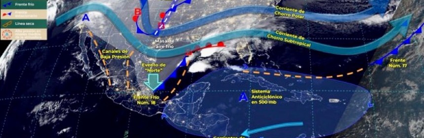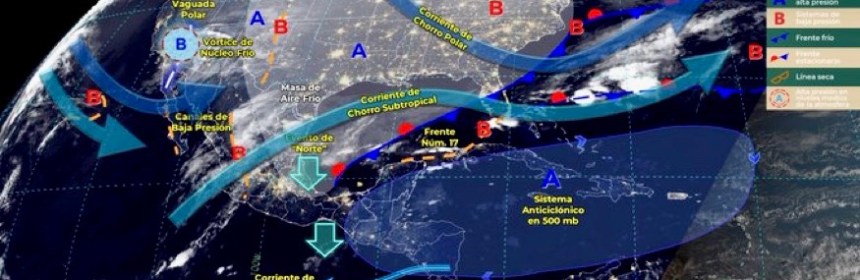 El Frente Frío número 17 y su masa de aire frío asociada, ocasionará lluvias puntuales intensas en Veracruz, Tabasco y Chiapas, así como evento de “Norte” en el Golfo de México, Istmo y Golfo de Tehuantepec. Este día, el frente Núm. 17 se extenderá con características de estacionario sobre el centro del Golfo de México e interaccionará con un canal