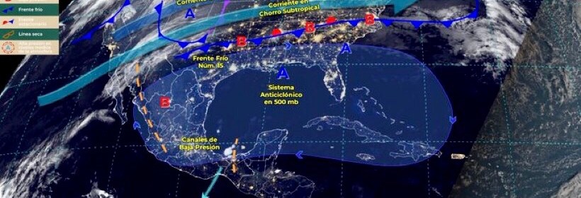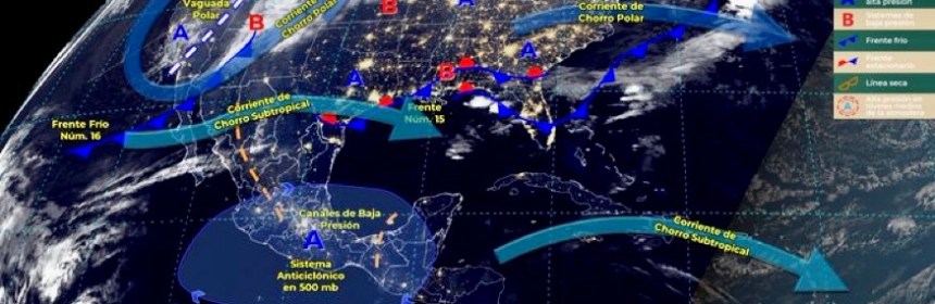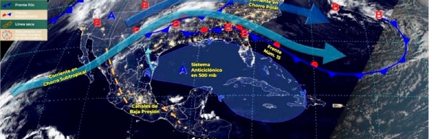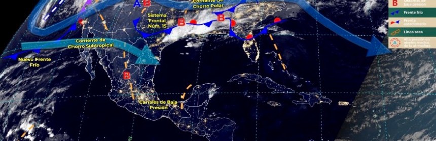 Prevén chubascos en el sureste del país y la península de Yucatán; así como temperaturas matutinas gélidas en zonas altas de Baja California, Sonora, Chihuahua y Durango. Este día, una nueva masa de aire frío reforzará al frente Núm. 15 sobre el norte y noreste del país, el cuál interaccionará con la corriente en chorro subtropical y con la entrada