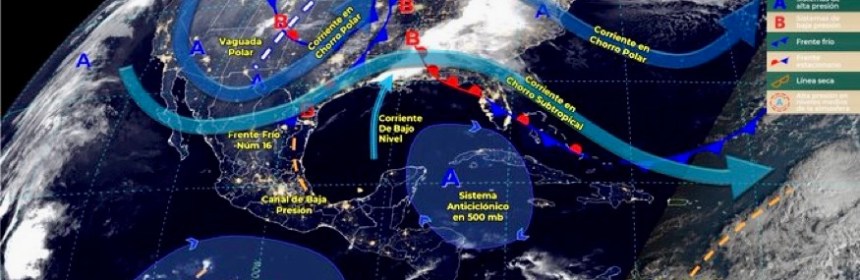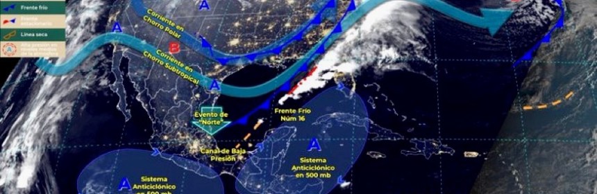 Pronóstico de lluvias fuertes en el Oriente y sureste del país, además de evento de Norte en costas de Tamaulipas y Veracruz. Este día, el frente frío Núm. 16 se desplazará sobre el noreste y oriente de la República Mexicana, en interacción con un canal de baja presión sobre el sur del Golfo de México, originarán lluvias puntuales fuertes en