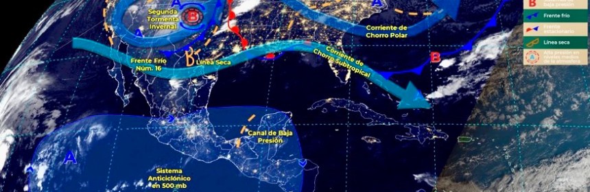 La segunda tormenta invernal y el Frente Frío número 16 mantendrán la posibilidad de caída de aguanieve o nieve, vientos muy fuertes, ambiente muy frío en el noroeste y norte del país. Para hoy, la segunda tormenta invernal se desplazará al norte de la República Mexicana y dejará de afectar en el transcurso del día. Mientras que, el frente frío