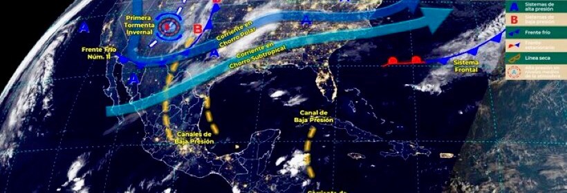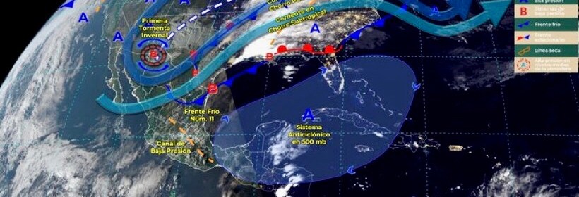 El Frente Frío número 11 en interacción con un vórtice de núcleo frío y una vaguada polar darán origen a la primera tormenta invernal de la temporada, produciendo posible caída de aguanieve o nieve en el norte de México. Durante este día, el frente frío Núm. 11 se desplazara rápidamente sobre el noroeste, norte y noreste de la República Mexicana,