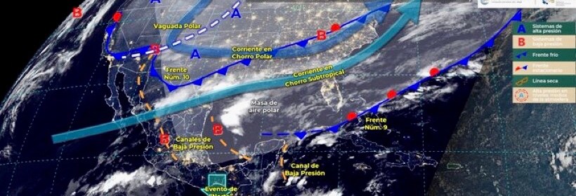 El Frente Frío número 10 y su masa de aire polar ocasionarán lluvias puntuales intensas en Tabasco y Chiapas, muy fuertes en Tamaulipas y Fuertes en Veracruz. Para hoy, el sistema frontal Núm. 9 cruzará el Golfo de México hasta una baja presión en Tamaulipas y continuará hacia Veracruz. Por su parte, el frente frío Núm. 10 se desplazará sobre Chihuahua, Coahuila, Nuevo León