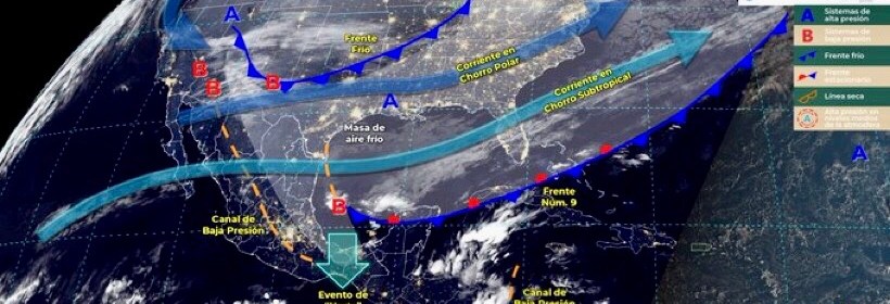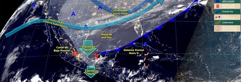 El sistema frontal número 9 y su masa de aire frío originará lluvias puntuales intensas en Veracruz, Tabasco, Chiapas y Oaxaca, así como evento de “Norte” fuerte a muy fuerte en litorales de Tamaulipas, Veracruz, Istmo y Golfo de Tehuantepec. Para hoy, el sistema frontal Núm. 9 se extenderá con características de estacionario desde el oriente del Golfo de México