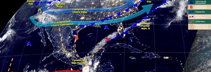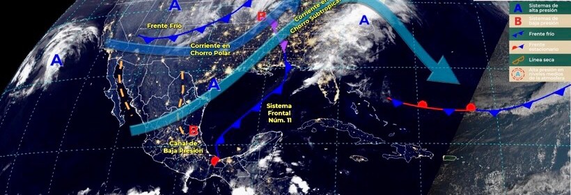 El Frente Frío número 11 y un canal de baja presión ocasionarán lluvias fuertes a muy fuertes en el Oriente y sureste del país, así como en la Península de Yucatán. Para hoy, el sistema frontal Núm. 11 se mantendrá estacionario desde el noreste del Golfo de México hasta el oriente del país, en interacción con un canal de baja presión extendido sobre el
