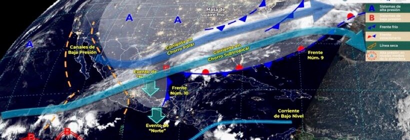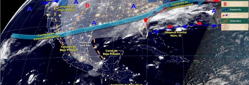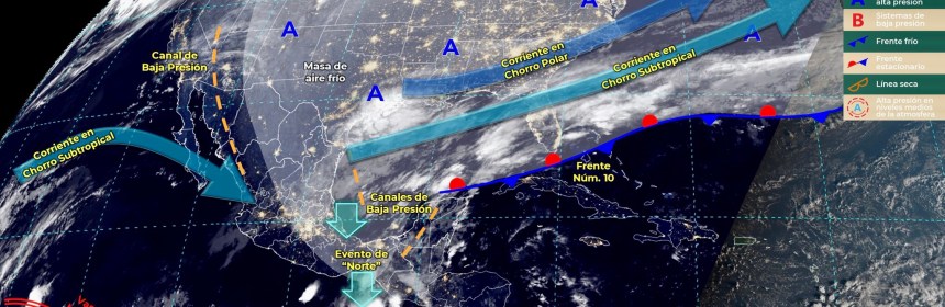 El Frente Frío número 10 producirán lluvias puntuales fuertes a intensas en el sureste de México y península de Yucatán, así como evento de “Norte” en el litoral del Golfo de México, Istmo y Golfo de Tehuantepec. Este día, el frente Núm. 10 continuará con características de estacionario sobre el Golfo de México e interaccionará con un canal de baja