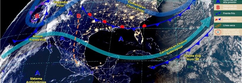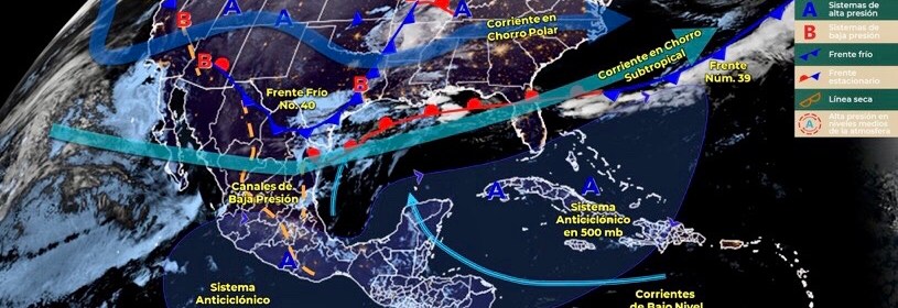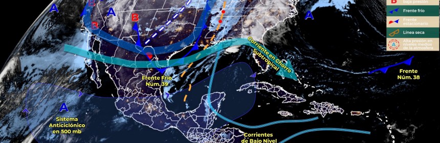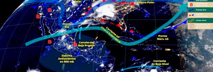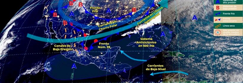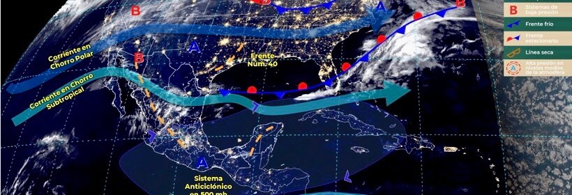El Frente Frío número 41 originará lluvias puntuales intensas en el Sureste del país, así como evento de Norte en el litoral del Golfo de México. Este día, el frente frío Núm. 41 recorrerá rápidamente el litoral del Golfo de México y durante la noche llegará hasta la Península de Yucatán; en su recorrido originará lluvias puntuales intensas que podrían generar incremento