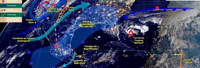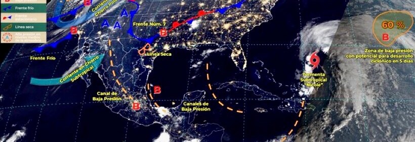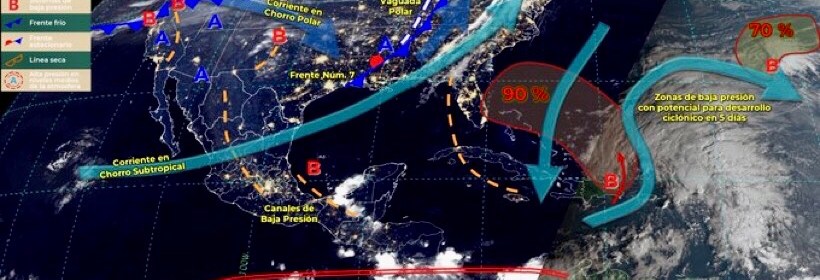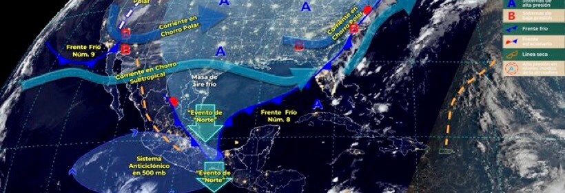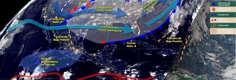 El Frente Frío número 9 ocasionará rachas de viento muy fuertes en el Noroeste y Norte de México. Este día, el frente Núm. 8 se extenderá sobre el Mar Caribe y ocasionará lluvias aisladas en Quintana Roo. A su vez, la masa de aire frío asociada a dicho frente, modificará sus características térmicas y ambos sistemas dejarán de afectar el territorio nacional. Por otra parte, el frente
