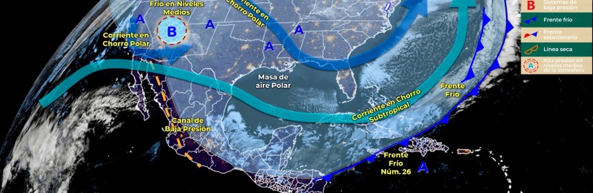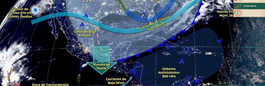 El Frente Frío número 28 y su masa de aire polar originarán ambiente muy frío, lluvias torrenciales, evento de Norte intenso y caída de nieve en zonas del Norte, Oriente y Sureste de México. Este día, la Quinta tormenta invernal dejará de afectar al territorio nacional. Por otra parte, el frente frío Núm. 28 recorrerá el sureste de México y