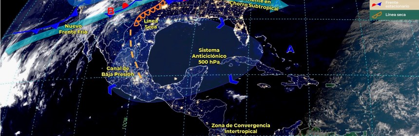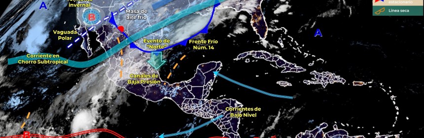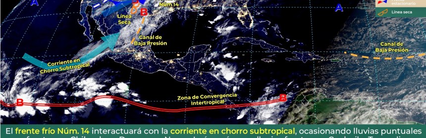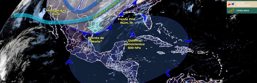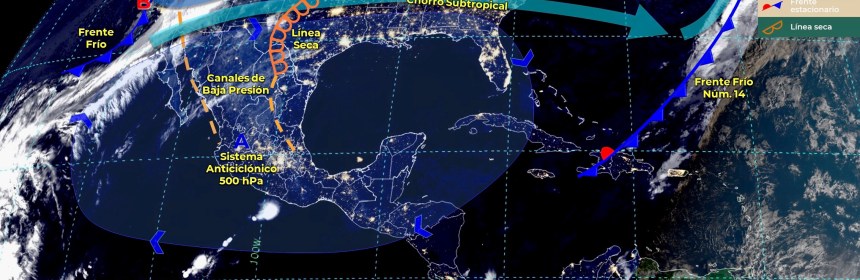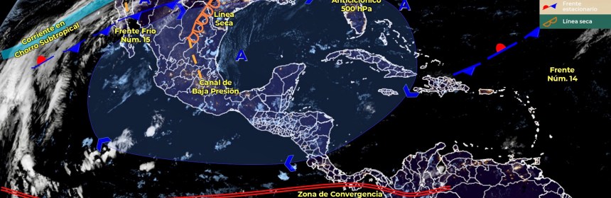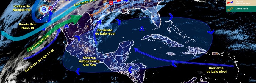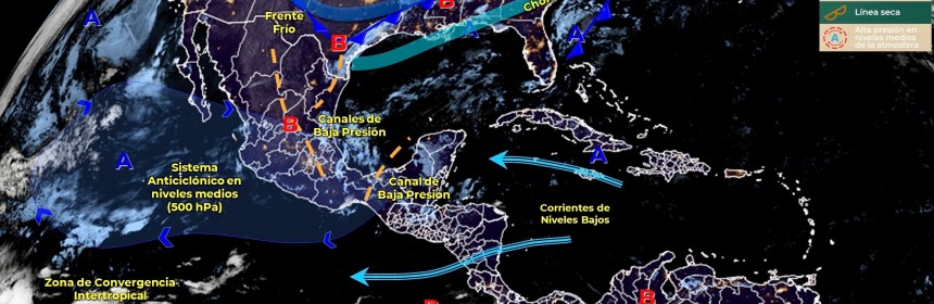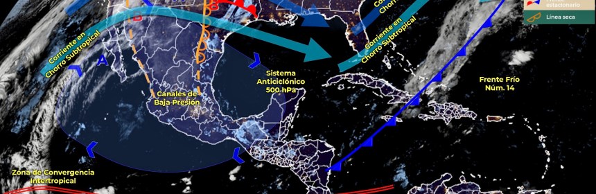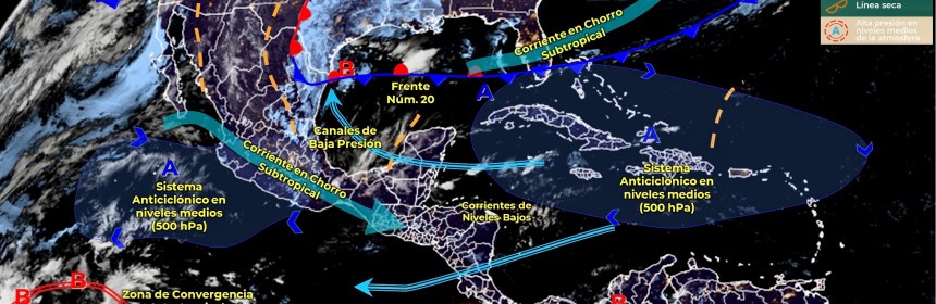 Lluvias fuertes con descargas eléctricas en Quintana Roo, e intervalos de chubascos en Campeche, y estados del Centro Sur y Sureste de México. Para hoy, el frente estacionario Núm. 20, en proceso de disipación sobre el noreste de México, generará lluvias aisladas en Tamaulipas y dejará de afectar al territorio en el transcurso del día. Asimismo, canales de baja presión en el centro y