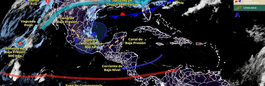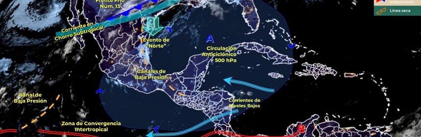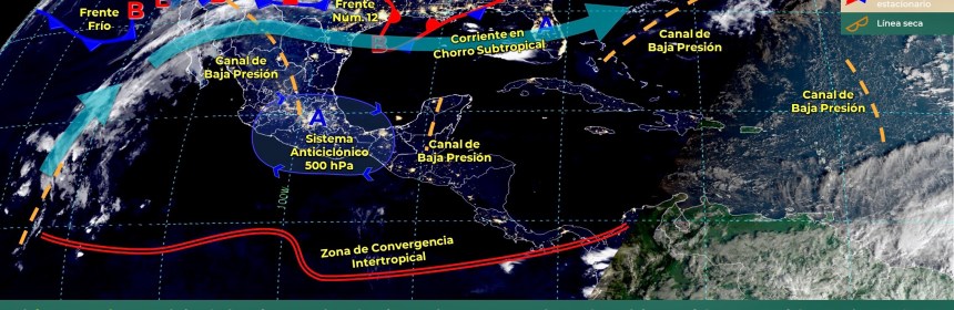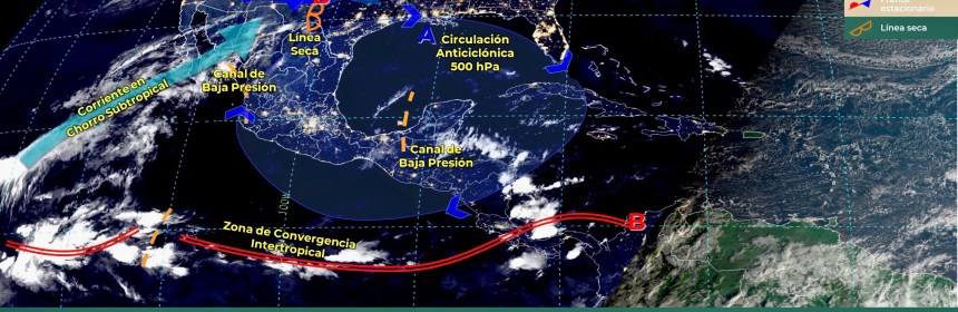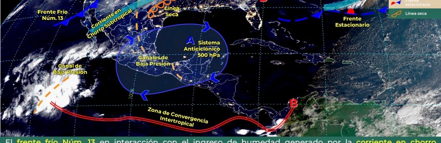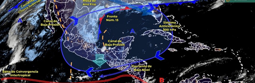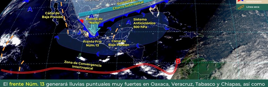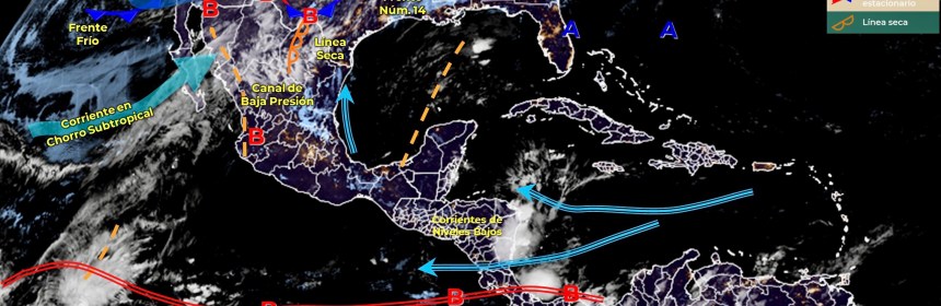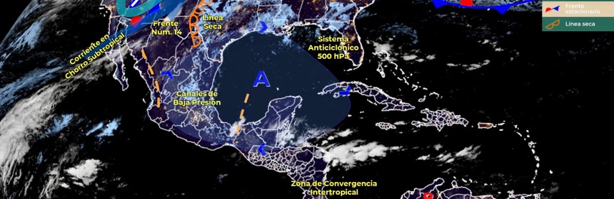 Lluvias puntuales fuertes en Quintana Roo y vientos fuertes en el Noroeste, Norte y Noreste del país, además de Surada en costas de Tamaulipas y Veracruz. Para el día de hoy, el frente Núm. 14 se mantiene como estacionario sobre la frontera norte del territorio nacional, seguirá interactuando con una línea seca sobre el estado de Coahuila, condiciones que generarán vientos fuertes con rachas de
