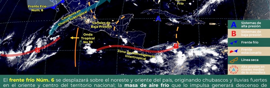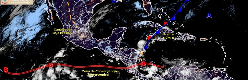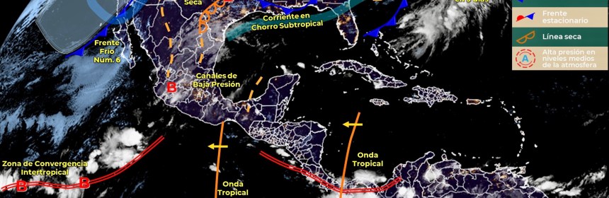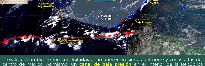 Se pronostican lluvias fuertes en el occidente y sur de México debido a un canal de baja presión. Para hoy, un canal de baja presión extendido sobre el occidente y centro de la República Mexicana, aunado a la entrada de humedad del Océano Pacífico y Golfo de México, originarán chubascos con lluvias puntuales fuertes en el occidente y sur del