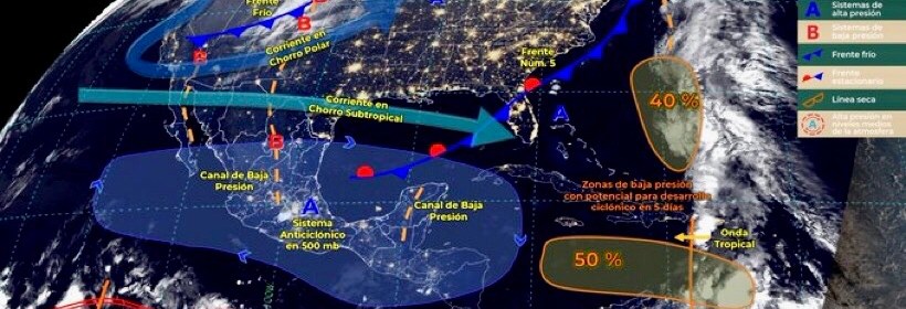 Un nuevo Frente Frío de aproximará al noroeste del territorio nacional. Este día, el frente Núm. 5 se extenderá con características cálidas sobre el Golfo de México, sin afectar a la República Mexicana. Por otra parte, un nuevo frente frío ingresará sobre el noroeste y norte de México, interaccionará con una vaguada polar y con la corriente en chorro subtropical,