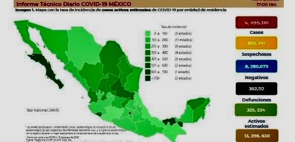 La Secretaría de Salud informó este miércoles que México suma 4 millones 495 mil 310 casos y 302 mil 112 muertes por Covid-19 La Secretaría de Salud informó este miércoles que México suma 4 millones 495 mil 310 casos y 302 mil 112 muertes por COVID-19. En las últimas 24 horas, el país registró 60 mil 552 contagios y 323