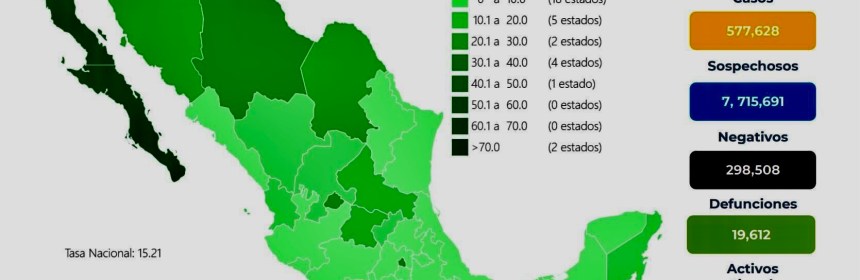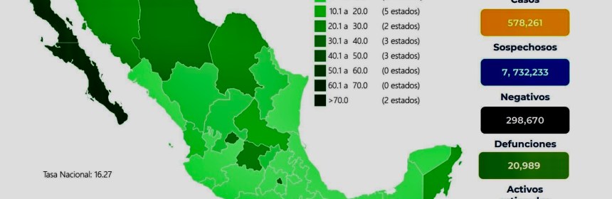 La Secretaría de Salud informó este viernes que México suma 3 millones 947 mil 284 casos y 298 mil 670 muertes por Covid-19 La Secretaría de Salud informó este viernes que Méxicosuma 3 millones 947 mil 284 casos y 298 mil 670 muertes por COVID-19. En las últimas 24 horas, el país registró 3 mil 520 contagios y 162 defunciones por el coronavirus SARS-CoV-2. Con