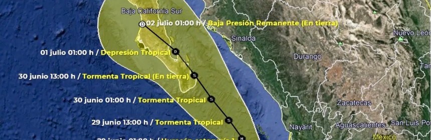 La tormenta tropical Enrique se ubicó a las 07:00 horas a 212 kilómetros (km) al sur-suroeste de El Roblito, Nayarit, y a 240 km al este-sureste de Cabo San Lucas, Baja California Sur. El pronóstico del tiempo para este martes indica lluvias puntuales intensas (de 75.1 a 150 milímetros [mm]) en el sur de Baja California Sur, Chihuahua, Durango y