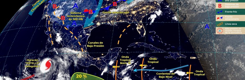 El Huracán “Estelle” ocasionará lluvias puntuales intensas que podrían generar deslaves e inundaciones en zonas de Sinaloa. Este día, el centro del Huracán “Estelle” se desplazará al sur de Baja California Sur. La entrada de humedad generada por su circulación en interacción con el monzón mexicano, reforzará las condiciones para lluvias puntuales intensas en Sinaloa, así como lluvias fuertes a