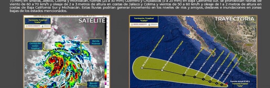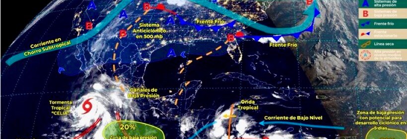 Lluvias puntuales fuertes en Baja California Sur, y estados del Noroeste , Occidente, Centro, Sur y Sureste de México. Para hoy, la tormenta tropical “Celia” seguirá desplazándose hacia el oeste-noroeste, alejándose gradualmente de costas nacionales; sin embargo, su circulación continuará generando lluvias fuertes sobre el occidente del territorio nacional y en Baja California Sur. A su vez, se prevén rachas