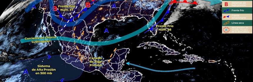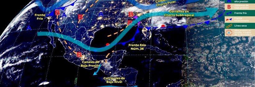 El Frente Frío numero 38 ocasionará chubascos en Quintana Roo y lluvias aisladas en el Sureste de México Para hoy, el frente frío Núm. 38 se extenderá sobre el occidente del Mar Caribe y ocasionará lluvias con intervalos de chubascos en Quintana Roo. La masa de aire frío asociada al frente, generará bancos de niebla en el sureste mexicano y lluvias aisladas en Veracruz,